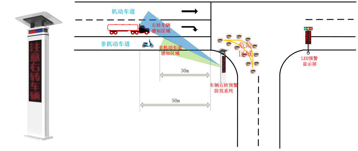 貨車右轉(zhuǎn)預(yù)警系統(tǒng)用于公路、道路交叉路口,對行人、非機動車、右轉(zhuǎn)機動車輛進行智能安全預(yù)警,大幅降低同類交通安全事故發(fā)生。包括機動車檢測單元、行人和非機動車檢測單元、聲光報警單元、信號處理控制單元、狀態(tài)檢測單元、太陽能控制單元和云管理單元。